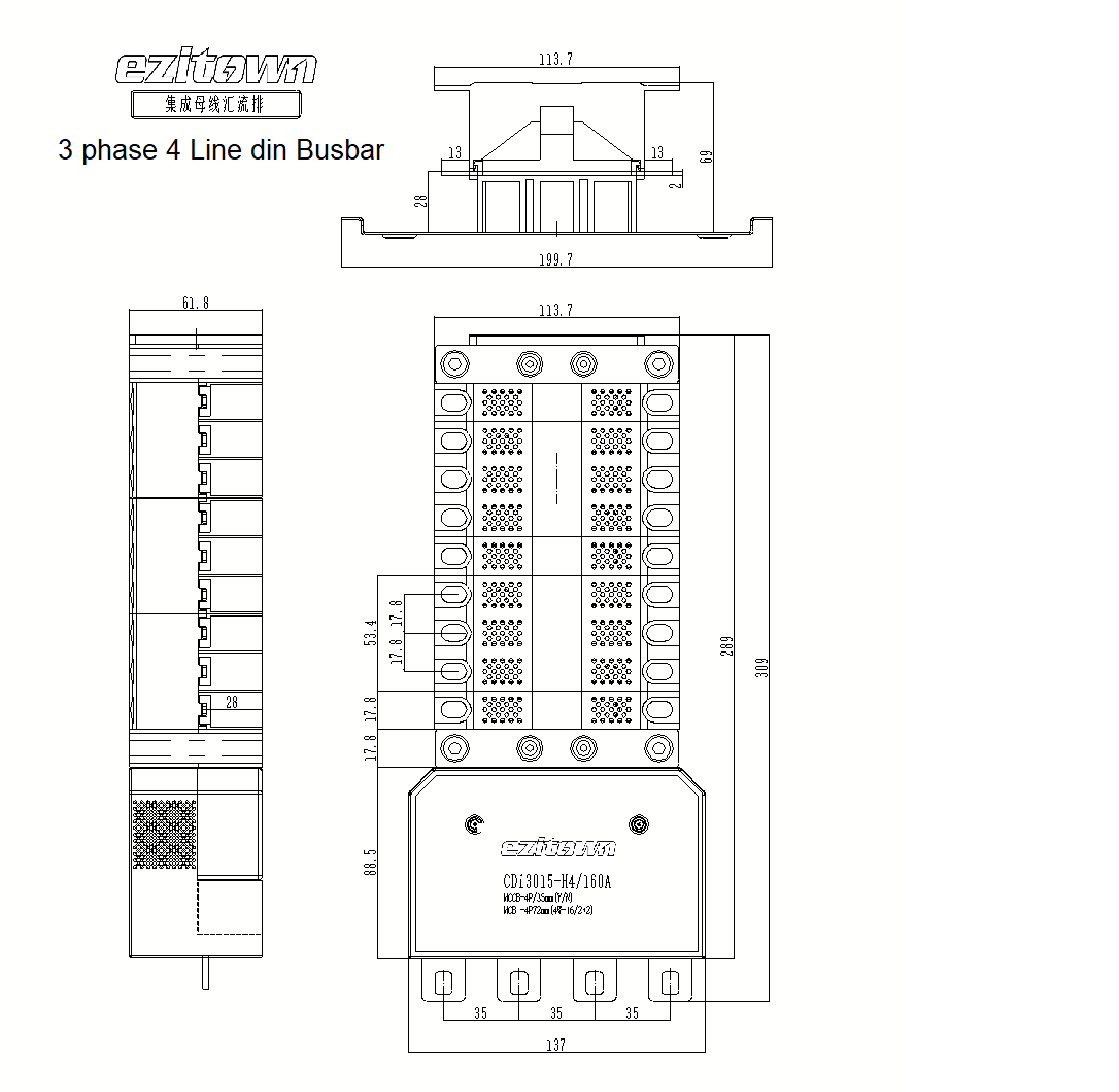 Din rail type 3 phase 4 wire 125A 160A 250A copper main load busbar
